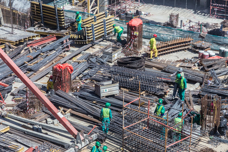 Laborers working on modern construction site works in Dubai. Fast urban development concept.
