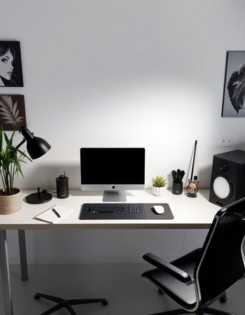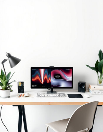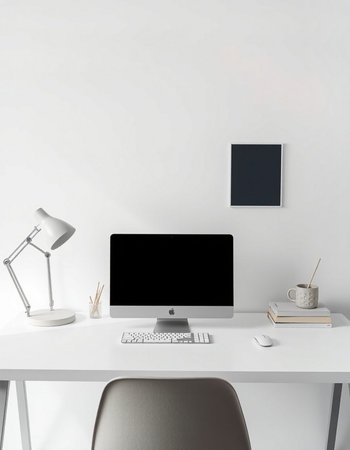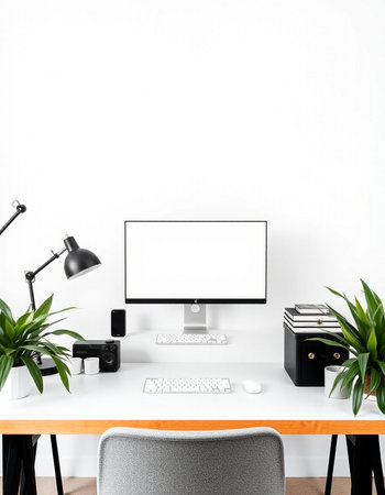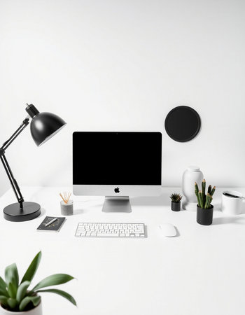 Modern workspace with computer, keyboard, mouse, lamp, and plant on white table.