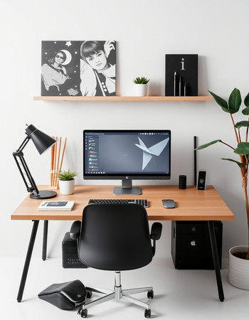 A clean and minimalist creative workspace with a laptop, drawing tools, and design inspiration on the walls.