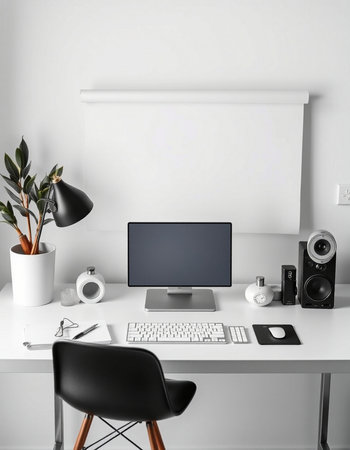 Minimal workspace with blank computer screen, stationery and copy space on white wall background