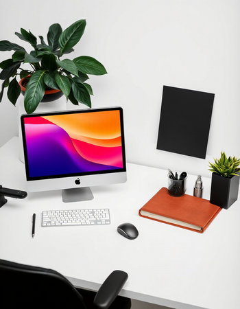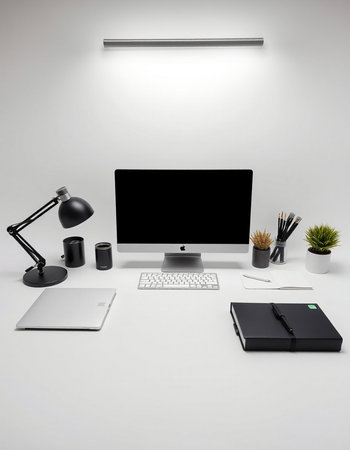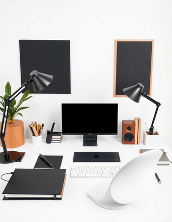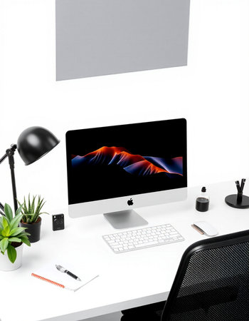 Modern workspace with computer, plant and desk lamp on white background.