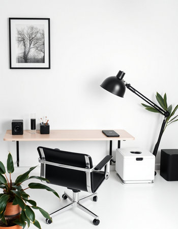 Modern white office interior with a laptop, a smartphone, a lamp and a plant.