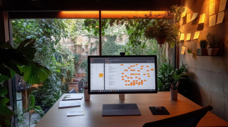 A modern workspace bathed in natural light, featuring a computer monitor, lush indoor plants, and an inviting atmosphere perfect for creativity and productivity.