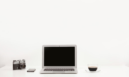 Minimalistic workplace with notebook, camera, mobile phone and cup of coffee. White background. Stylish modern sparse interior working place.