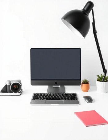 Modern workspace with computer, lamp, camera and notebook on white background