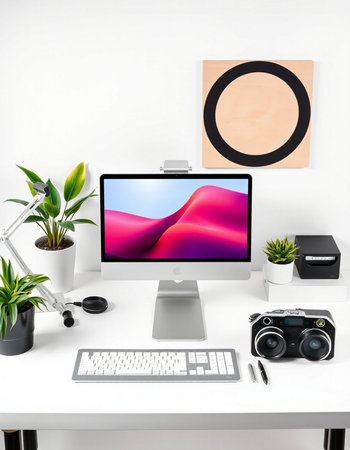 A laptop computer sits open on a bright white desk, accompanied by a keyboard, mouse, and a small potted plant. The setting is clean and minimalist, with neutral colors and soft lighting. This image could be used for various purposes, including website design, advertising, and marketing materials.