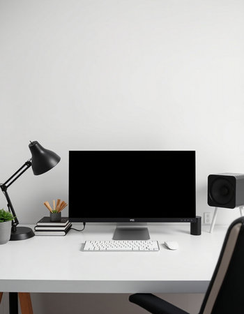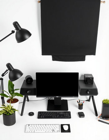 Modern home office with black computer and black desk. Workplace and lifestyle concept