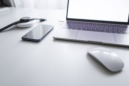 laptop with smart watch computer mouse and phone charging on wireless charger on white table