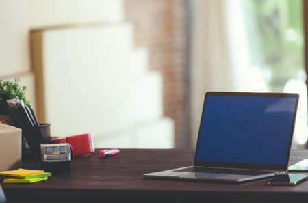 Comfortable workspace with blank screen laptop computer with mailbag and office supplies next to the windows
