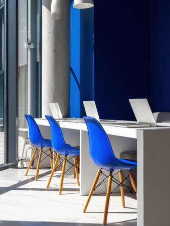 Open workspace features sleek furniture, bright blue accents, and ample natural light, creating an inviting atmosphere for productivity.