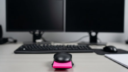 Cinematic wide shot of a pristine office desk setup, featuring a classic, yet subtle, April Fools' o