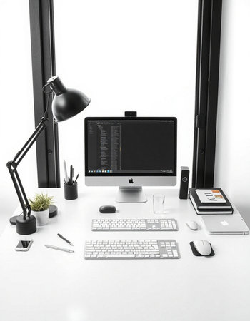 Modern designer desktop with computer, keyboard, mouse, notebook and other items