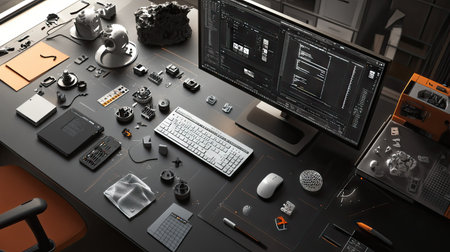 A top-down view of a 3D modeling workspace on a computer, with software open and various tools and layers visible, highlighting the design and editing process
