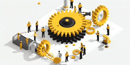 Business People Standing on Metallic Gears Representing Teamwork, Innovation, and Industry