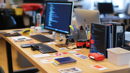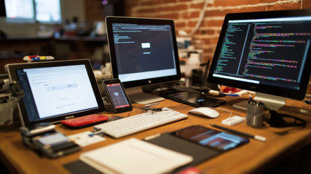 A vertical shot of programmer's desk with types of electronic equipment displaying codes