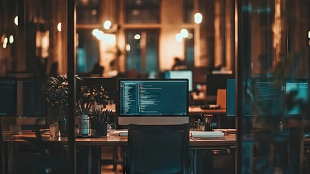an office with multiple monitors on the desks and computers in front of them, all lit up at night time. Generative AI