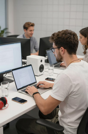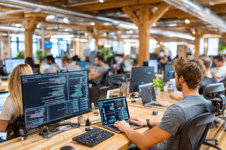A bustling tech start-up office with people working on computers, with a dynamic, energetic mood, shot with a 50mm lens, showcasing the modern work culture, ultrarealistic photo --ar 3:2 --raw --profile nk3i4wf --stylize 250 --v 7 Job ID: 0a9395d7-1ba6-4885-912b-8c0a1a4dde67