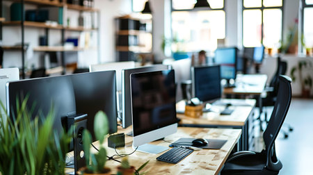 Modern office with sleek design and computer workstations in open layout. That the image is generated using AI.