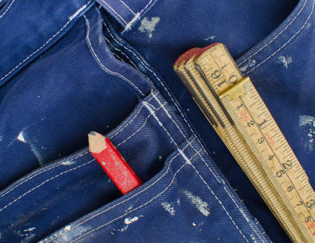 Unrecognizable person on construction site wearing protective worker red black pants trousers