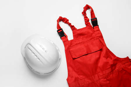 side view of worker wearing overalls and red helmet and protection eyeglasses