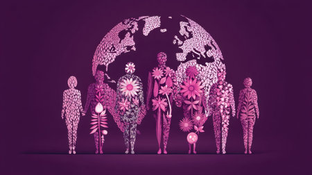 This captivating artwork showcases human silhouettes adorned with floral patterns against a global backdrop, symbolizing beauty, diversity, and ecological awareness.