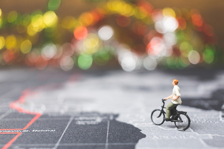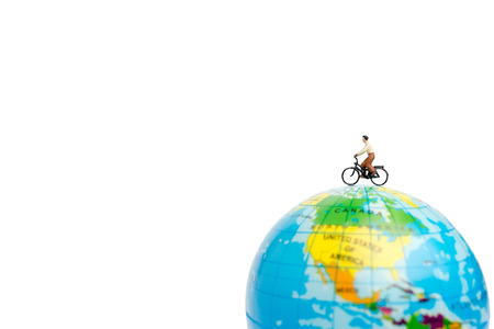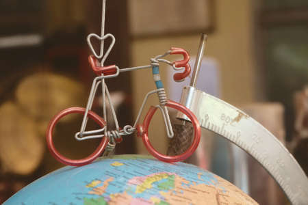 Miniature Bicycle Figure on Geography Globe or Planet Sphere Model, Cyling to Destination.
