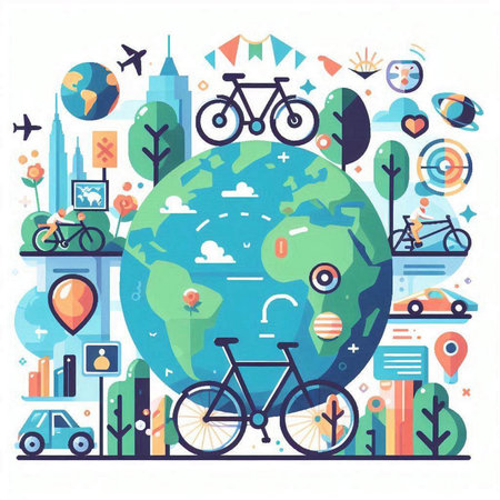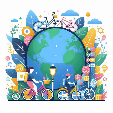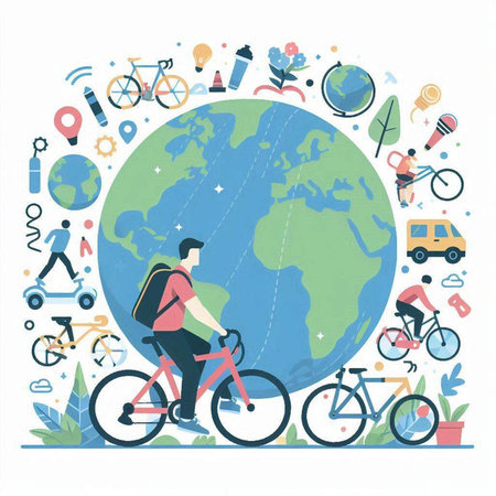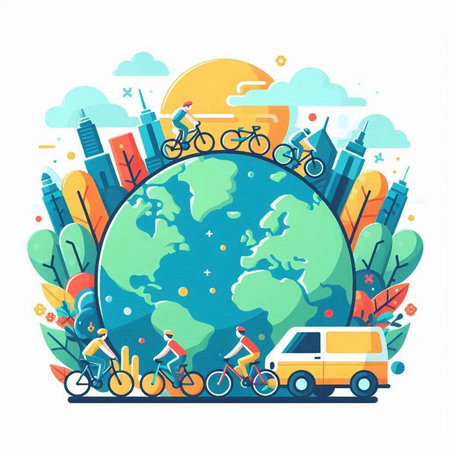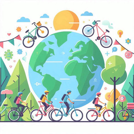 Vector illustration of people riding bikes around the world. Ecological concept.