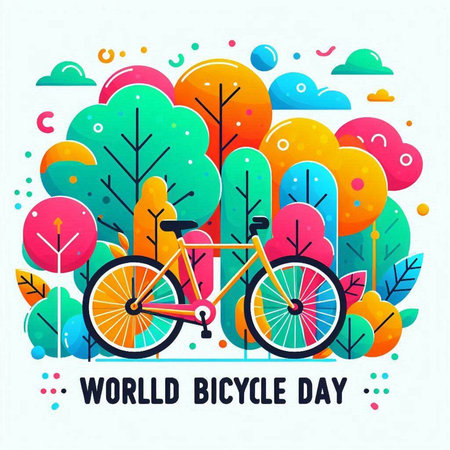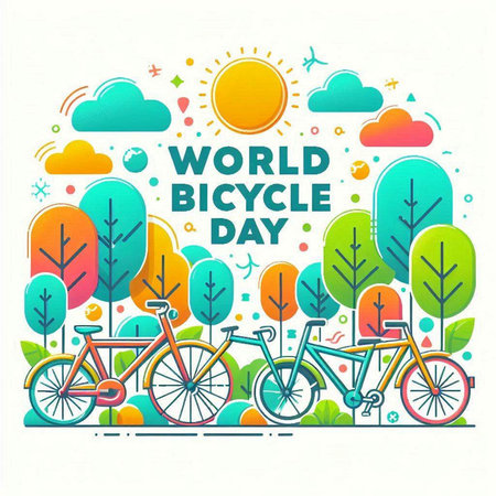 World Bicycle Day. Vector illustration with bicycle, trees, sun and clouds.