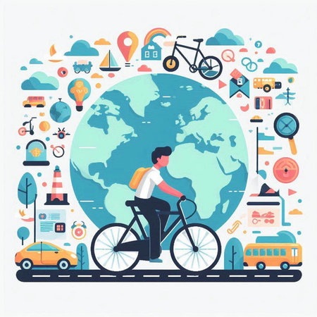 Flat design vector illustration concept of bicycle around the world. Eco friendly lifestyle.