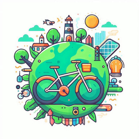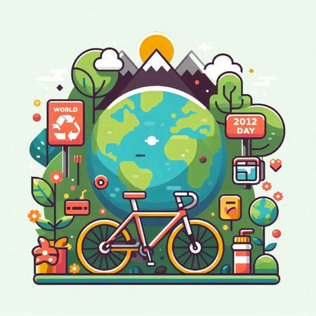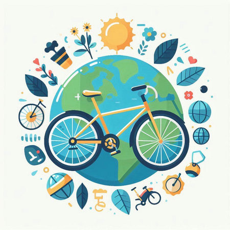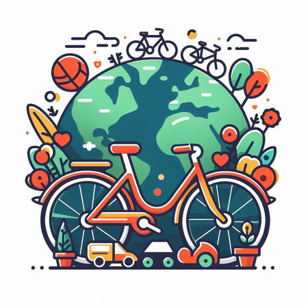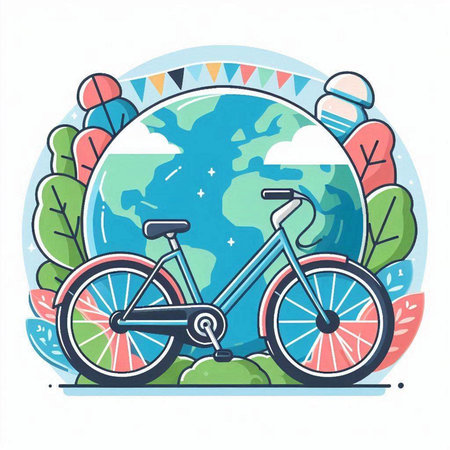 Vector illustration of a bicycle with a globe and flowers in the background.