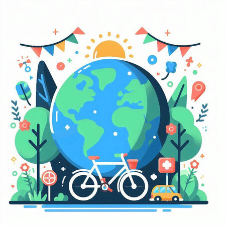 Earth Day: An eye-catching, colorful background design template with the planet Earth shaped as gorgeous, artistic bicycles that is ideal for wildlife conservation projects.