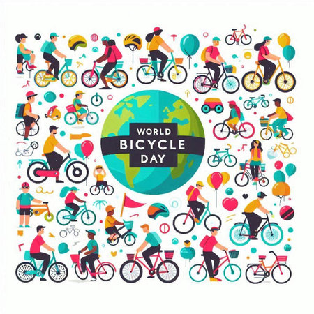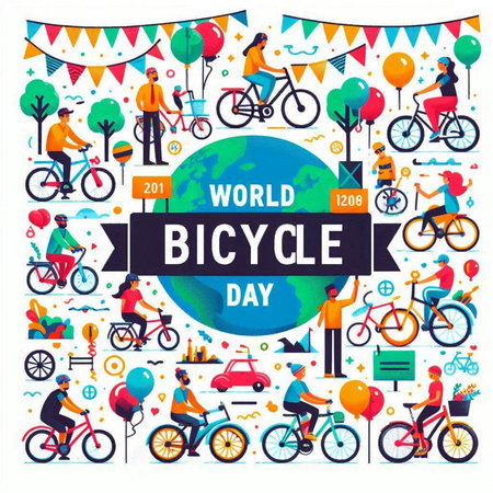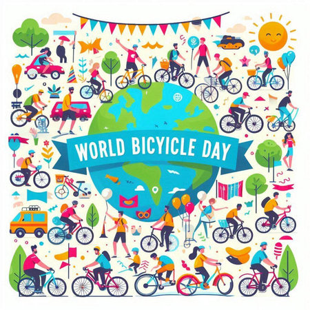 World Bicycle Day greeting card with bicycle riders. Flat vector illustration.
