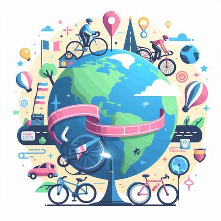 Vector illustration of a cyclist riding a bicycle around the world. The concept of healthy lifestyle, sports and recreation.