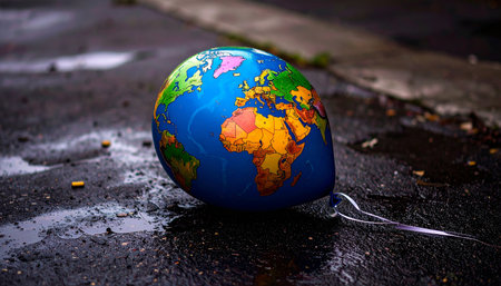 Globe printed balloon fully deflated and lying flat on smooth concrete, symbolizing global market collapse or recession, overcast light, minimalist setup