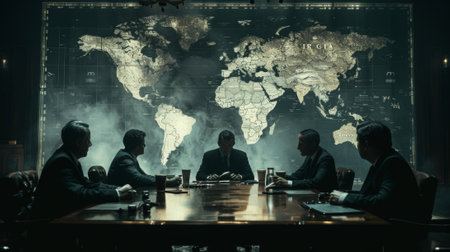 Politicians convene around a table to discuss global strategy while standing in front of a world map