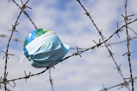 On planet earth, a medical mask to protect against the coronavirus epidemic. Concept of a global virus epidemic, concept of Corona virus quarantine, Covid-19.