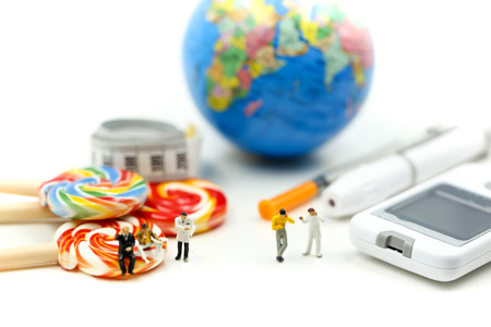 Miniature people : Doctor patient Sweet candy with Insulin syringe,lancet,test strip,glucose meter and lancing device concept of diabetes and reduction of eating sweets