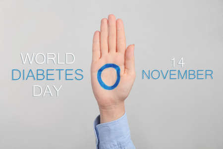 Woman showing blue circle drawn on palm against light gray background, closeup. World Diabetes Day