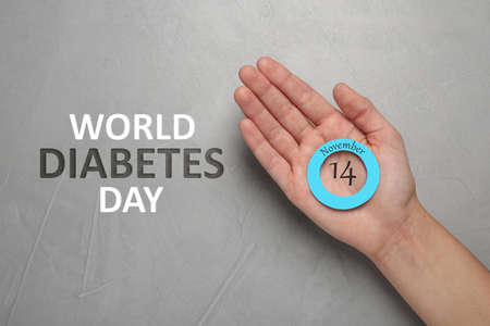 Person holding piece of paper with the words World Diabetes Day (14 November). Close up.
