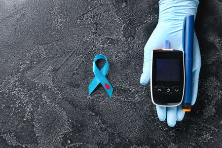 Glucometer with lancet pen, blue ring and awareness ribbon on color background. Diabetes concept