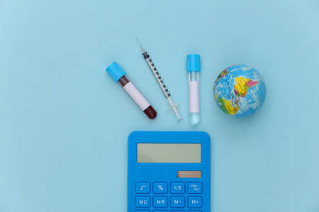 Test tube with blood, syringe with globe, calculator on blue background. top view