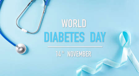 World diabetes day awareness concept, stethoscope with blue ribbon on pastel background, 14 November.