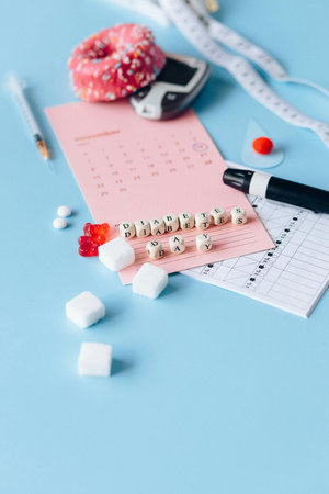 Glucose meter, measuring tape, sugar cubes, donut and notebook on blue background