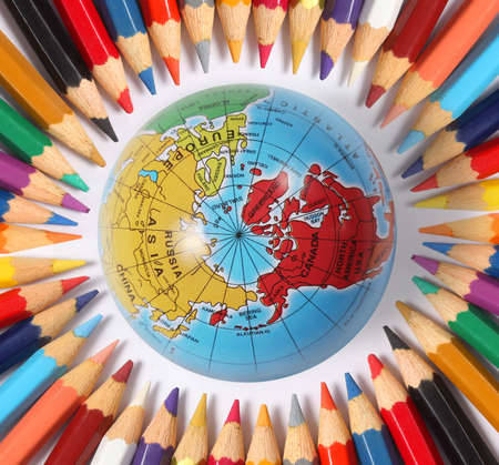 A globe with a black cap on top of it and a book with a pencil on it. The globe is surrounded by a lot of paper and pencils. Concept of education and learning