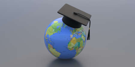 Graduation cap with Earth globe. Concept of global business study, abroad educational, Back to School. Education in Global world, Study abroad business in universities in worldwide. language study