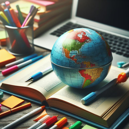 A wooden table has an open book on it with colorful flags and a globe in the background, emphasizing the themes of knowledge, exploration, and diversity