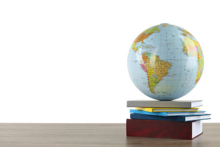 A globe sits on a table with a stack of books and a pencil holder. Concept of education and learning, as the globe represents the world and the books represent knowledge