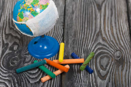 Globe with medical mask. Nearby is a colored pastel. Academic year during the epidemic.