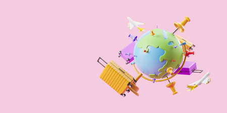 Cartoon earth globe with pins, suitcases and flying airplanes on pink background. Concept of travel and relax. copyspace. 3D rendering
