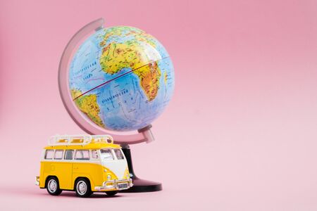 Tourism and travel concept. Globe, camera on pink blue pastel background. Top view. Flat lay
